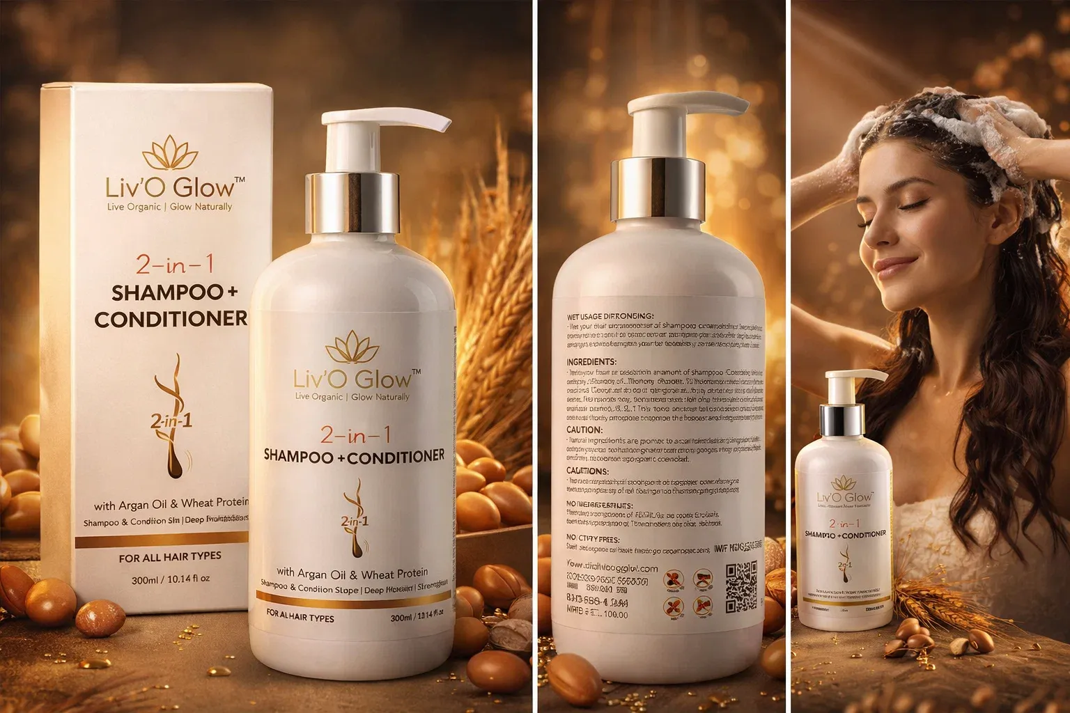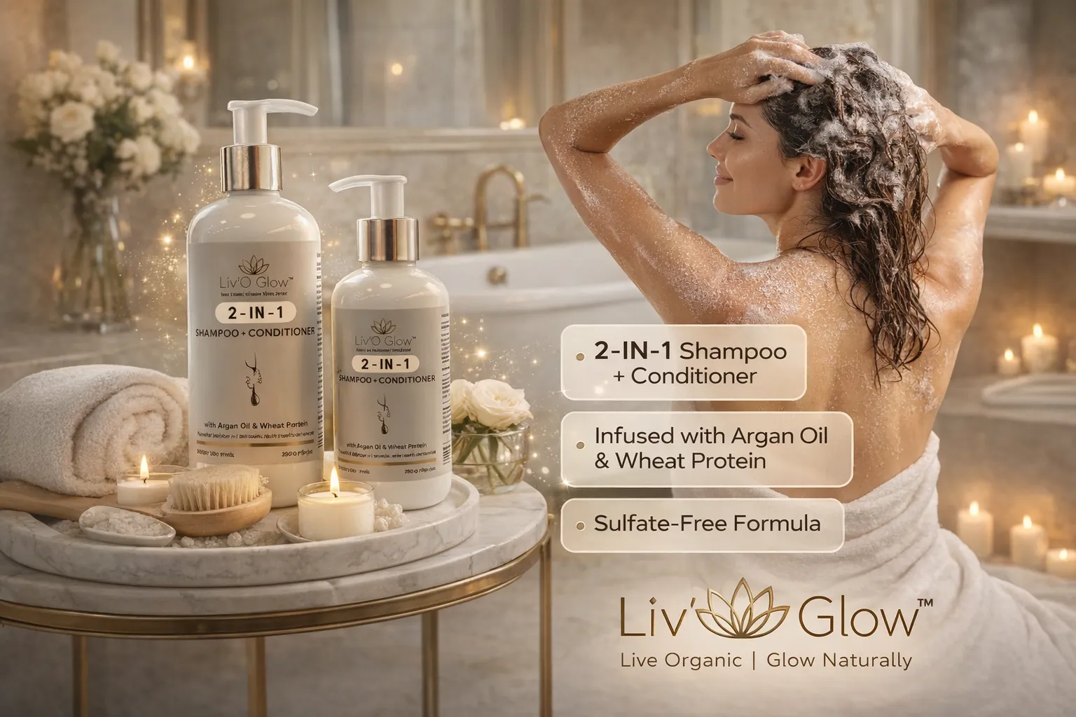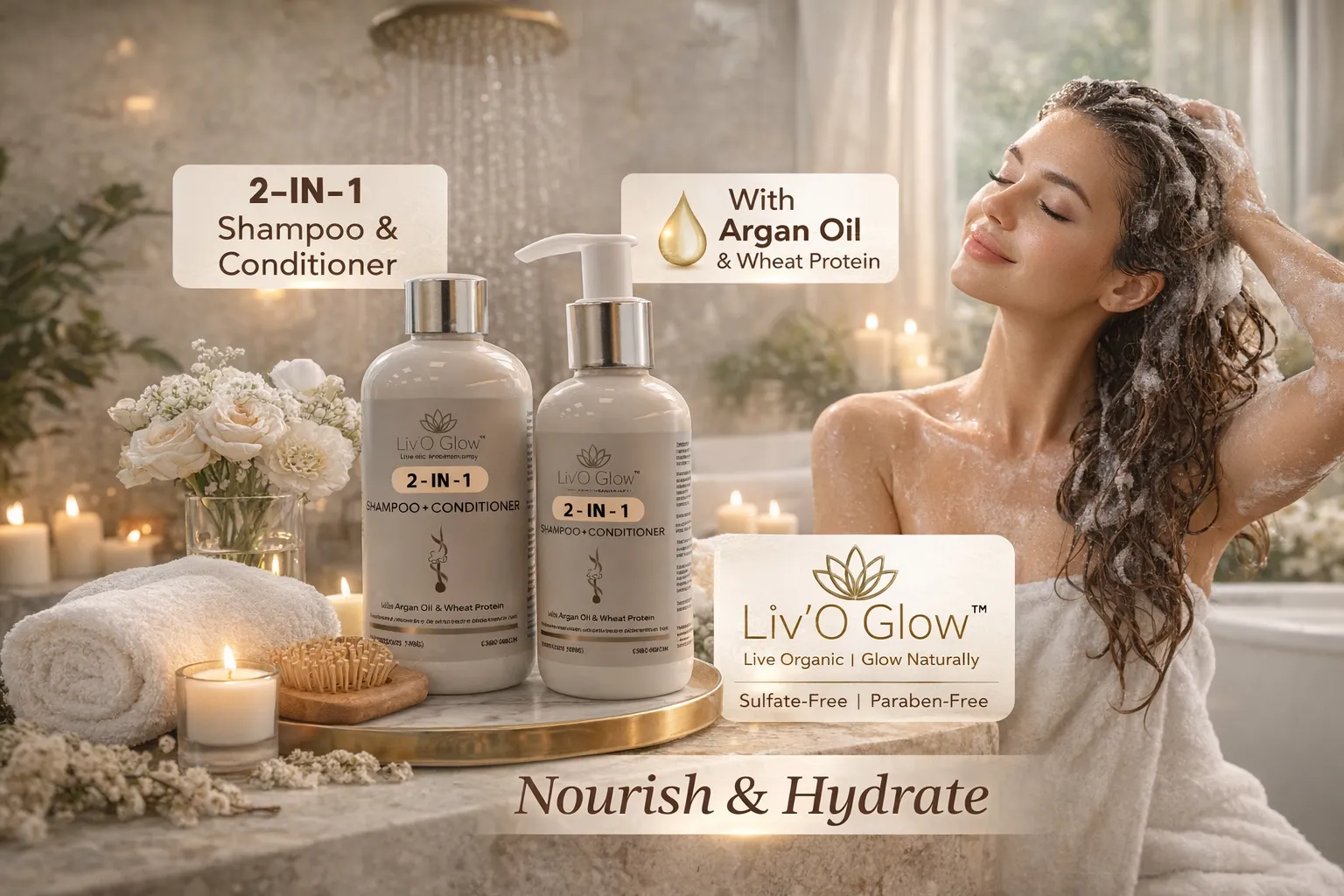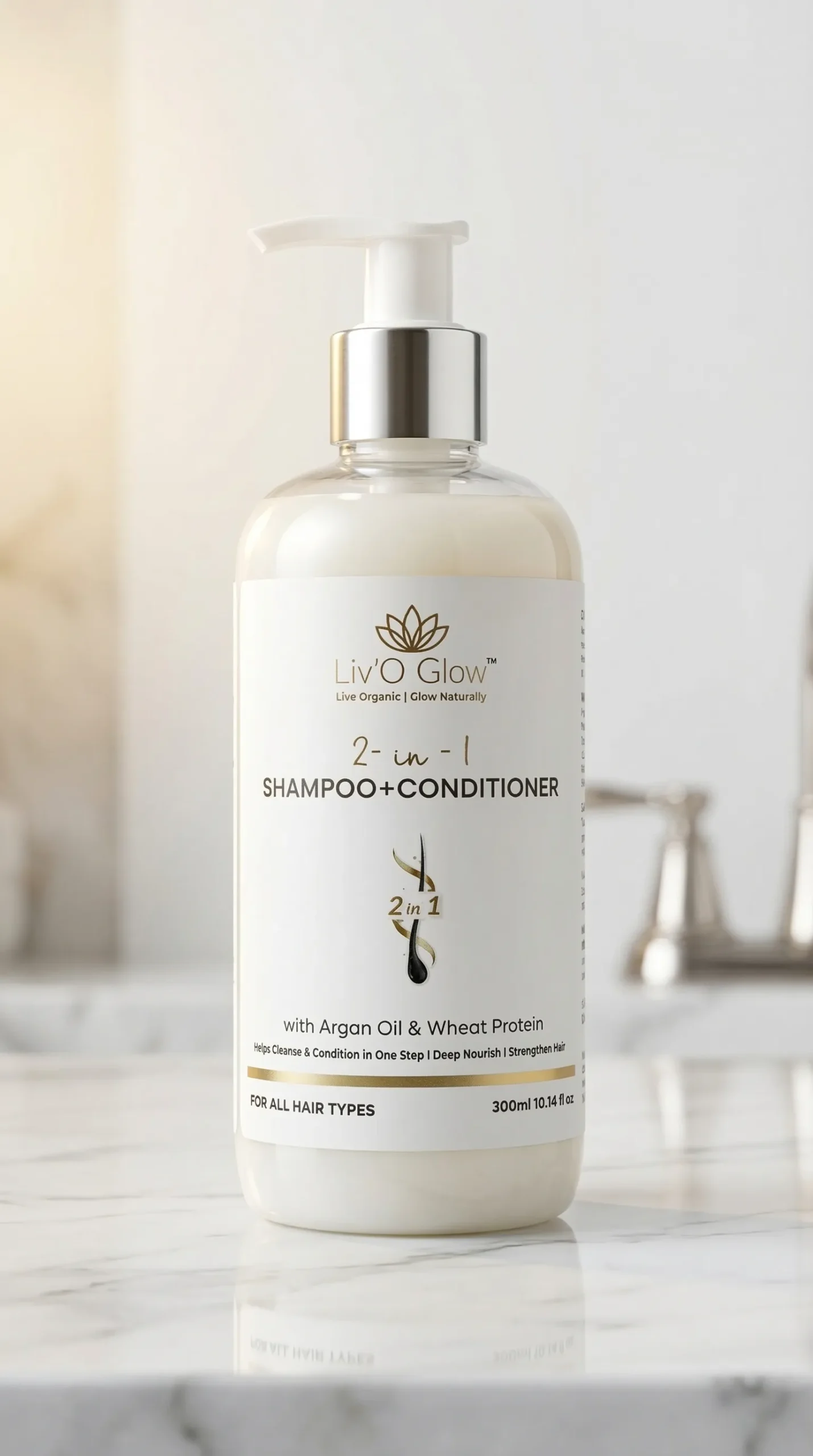 Cleanse and condition your hair in one luxurious step with LIv’O Glow 2-in-1 Shampoo + Conditioner, a dual-action formula that combines Ayurvedic oils with advanced nourishing actives. This rich, deep burgundy bottle blends spa-like indulgence with clinical-grade results—perfect for dry, frizzy, or damaged hair.