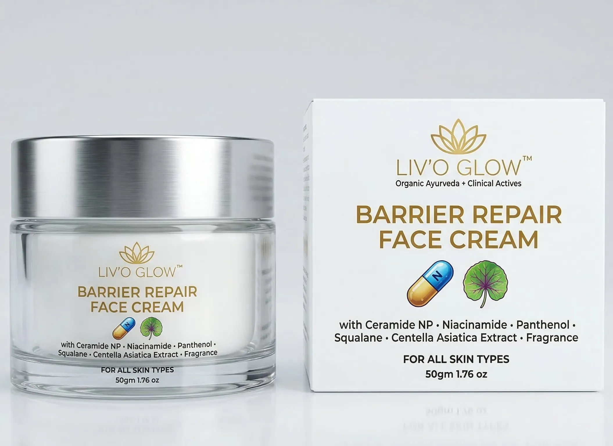 Experience deep skin repair and hydration with the LIv’O Glow Barrier Repair Face Cream, crafted with the perfect balance of Organic Ayurveda and Clinical Actives. Housed in a sleek ivory glass jar with a regal gold lid, this cream nourishes and restores your skin barrier using a potent blend of: