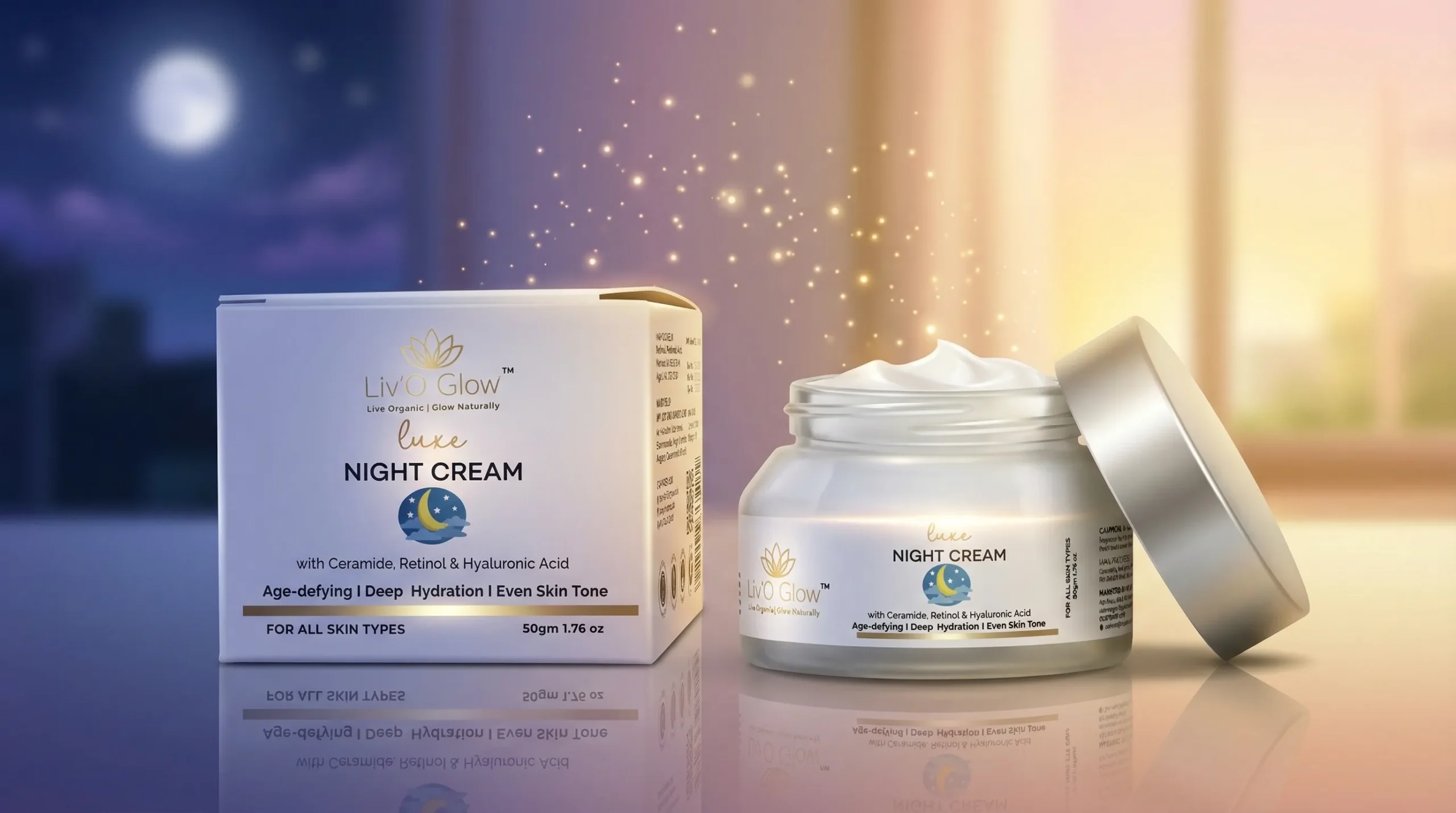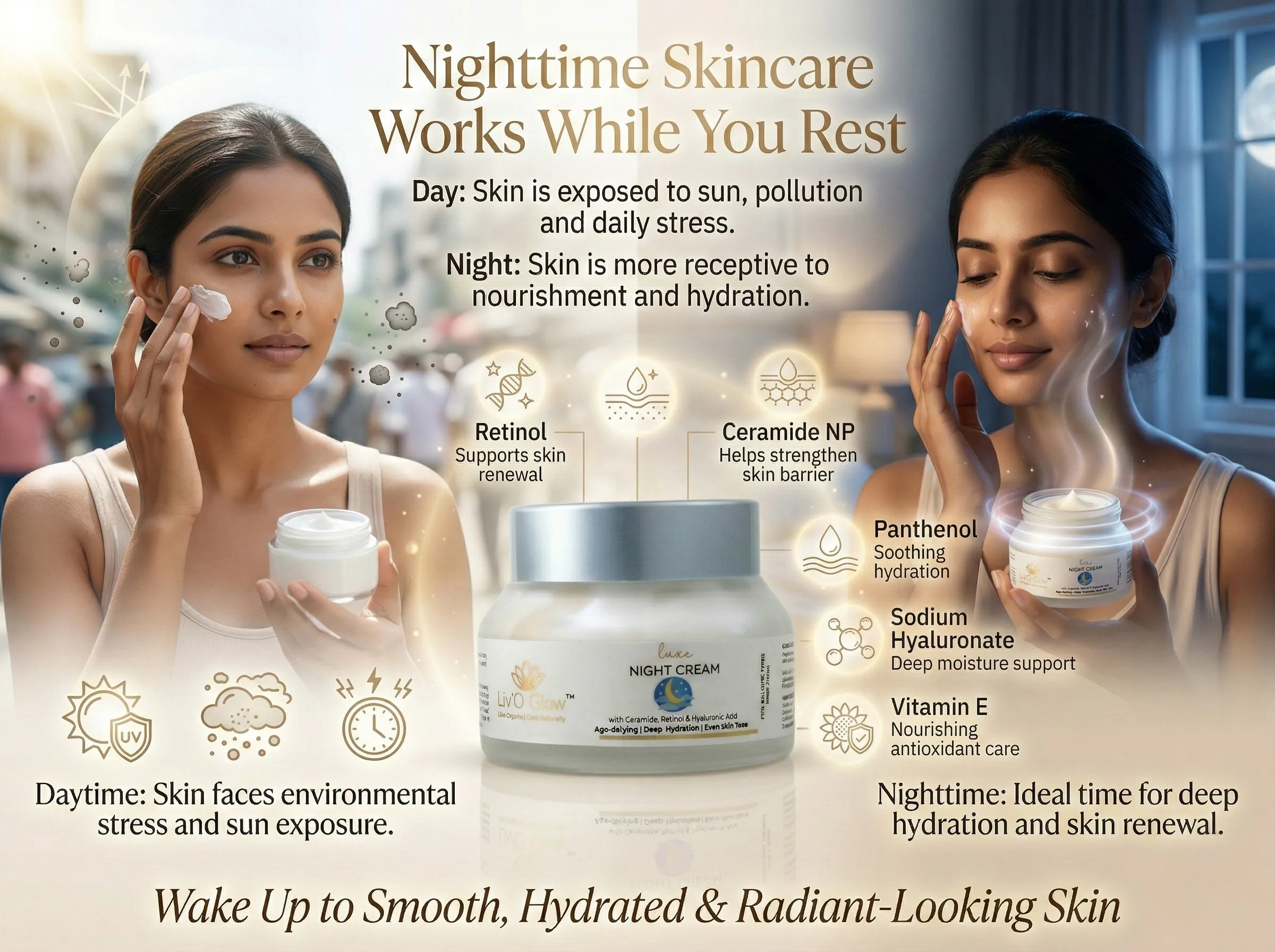 During the night, your skin naturally enters its repair mode. Liv’O Glow Luxe Night Cream works in harmony with this process, delivering powerful hydration and skin-renewing ingredients that help restore your skin’s vitality and youthful glow.